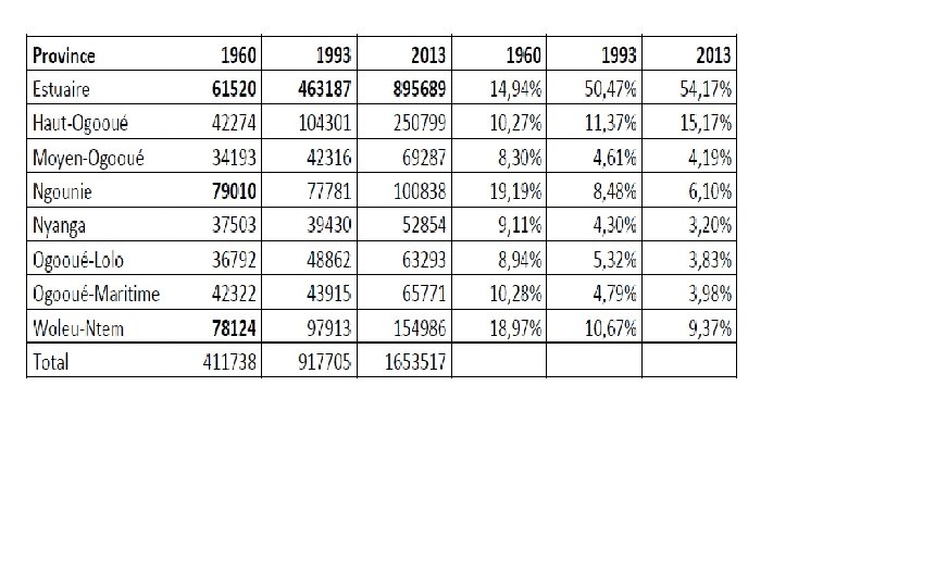Pourquoi Libreville 2 est-elle une fausse bonne idée ? En remontant à 1960, on constate que l’Estuaire était la troisième province la plus peuplée, avec seulement 15% de la population du pays. Cependant, les derniers recensements de 2013 placent l’Estuaire en tête avec une écrasante majorité de 54%. Comment en sommes-nous arrivés là ? Le développement du pays n’a jamais été équilibré ; tout a été centralisé à Libreville. Depuis 1960, les gens n’ont cessé de quitter l’hinterland pour la capitale, créant ainsi un déséquilibre de développement flagrant entre Libreville et les autres régions.